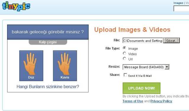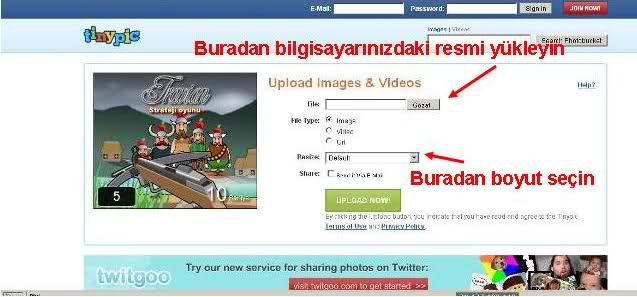 Öncelikle tinypic resim upload sitesinin linkine týklayýp, siteye giriyoruz.