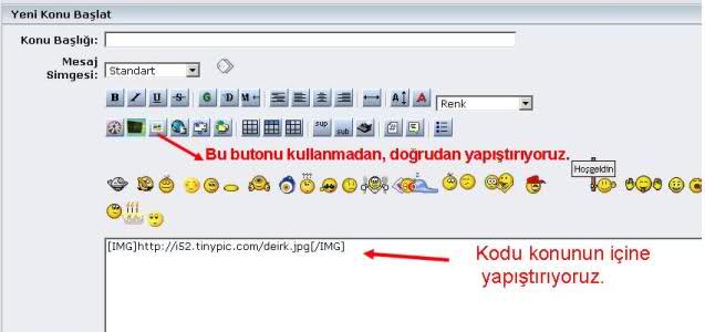 Bu sitede resim ekleme html kodu bütün olarak veriliyor. Resmin link adresi img........./img taglarý arasýna yapýþtýrýlmýþ olarak veriliyor. Sadece kopyaldýðýmýz parçayý, konuya yapýþtýrmamýz yeterli.