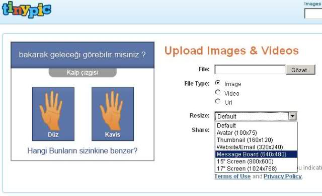 File penceresinin Gözat butonuna týklayarak, kendi bilgisayarýmýzdan yükleyeceðimiz resmi seçiyoruz. Resize penceresinden yükleyeceðimiz resmi yeniden boyutlandýrabiliriz. Eðer resminizin orijinal boyutu, 640 X 480den küçükse bu pencereyi hiç açmayýn, default olarak kalsýn.